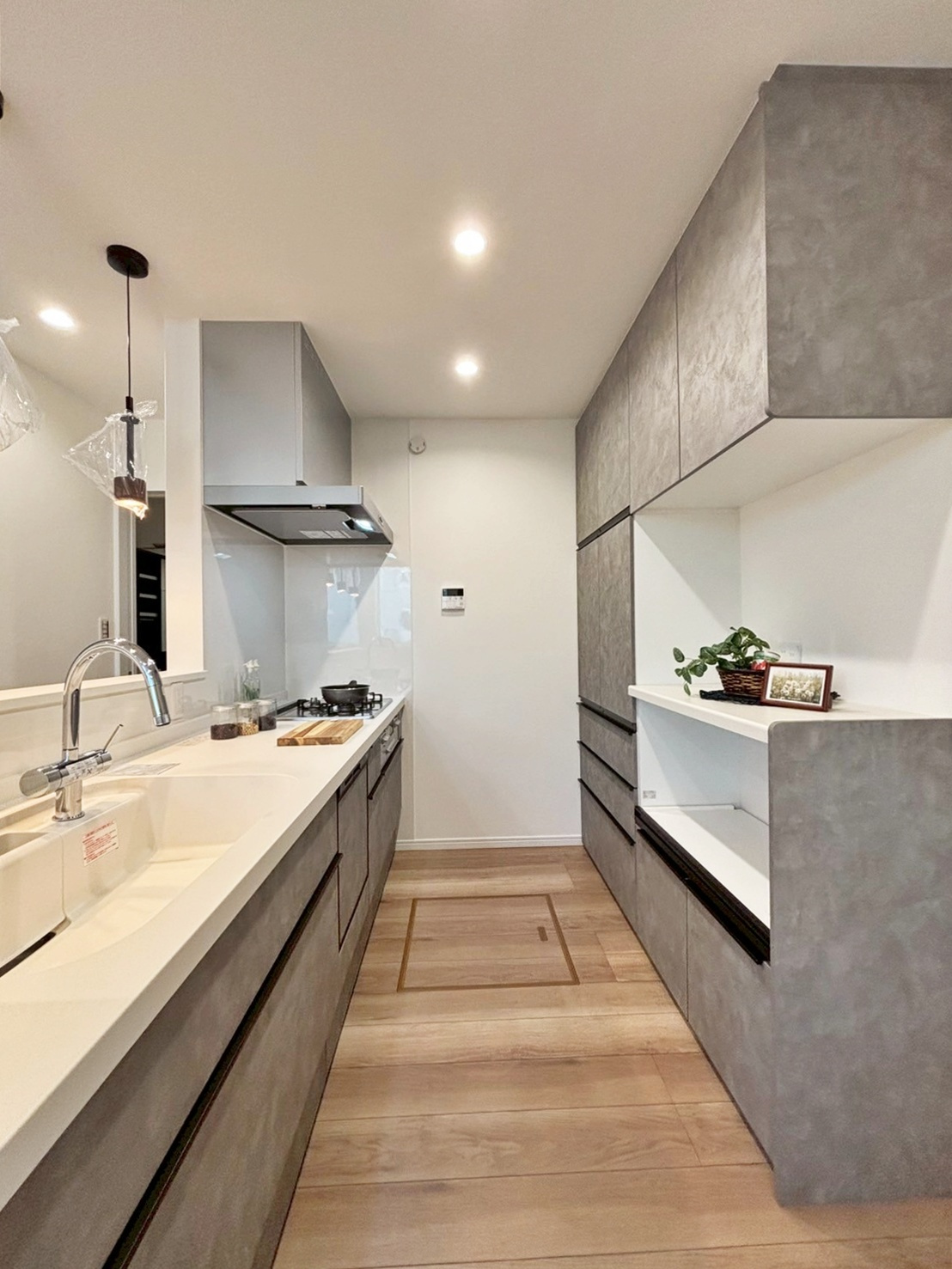 システムキッチンは、広々とした調理スペースを確保し調理楽々、ワイドシンクで洗い物も楽々です!