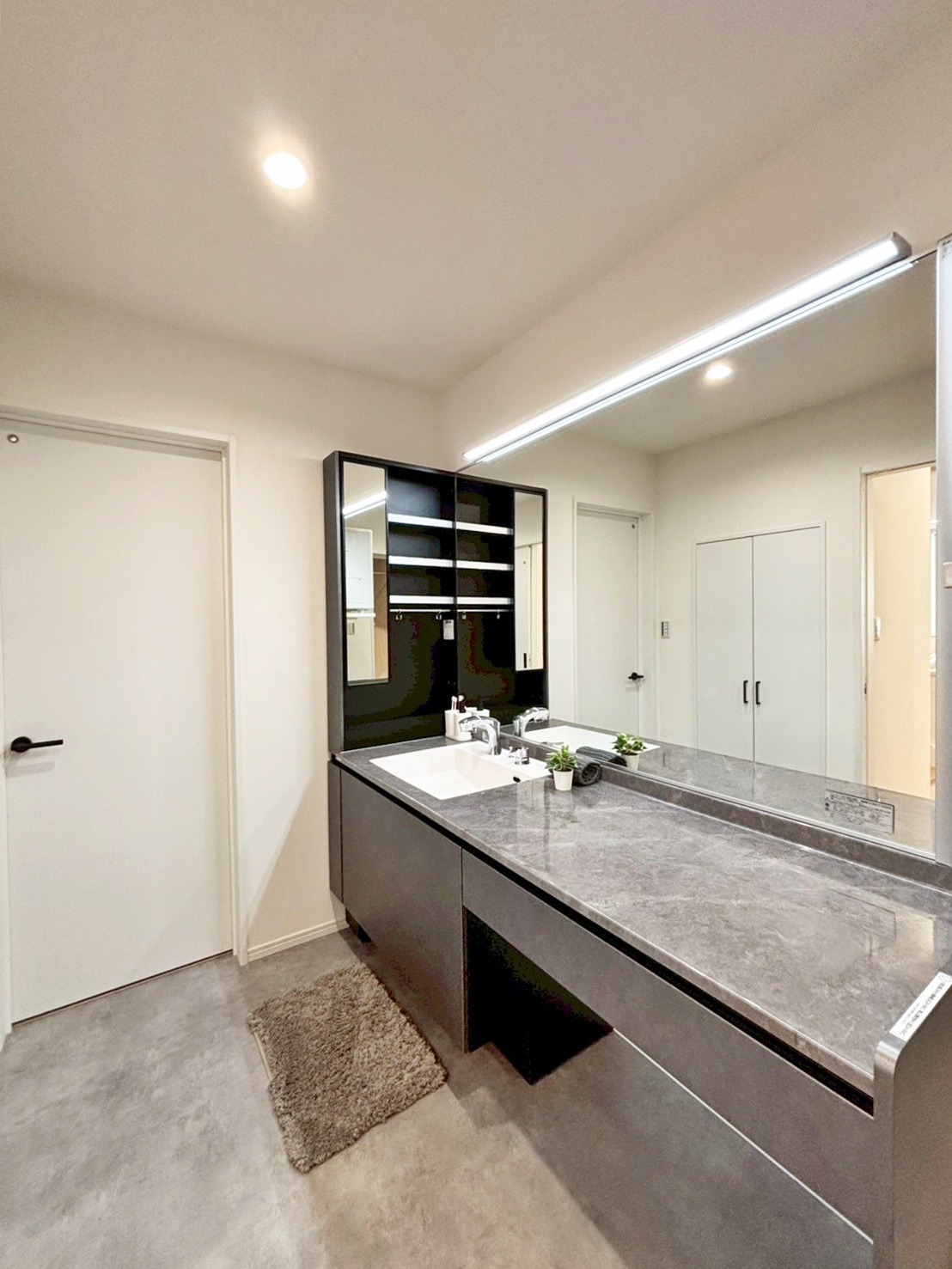 大理石調のワイドカウンターとシンプルな大型ミラーで、特別感のあるおしゃれな雰囲気に仕上げました。