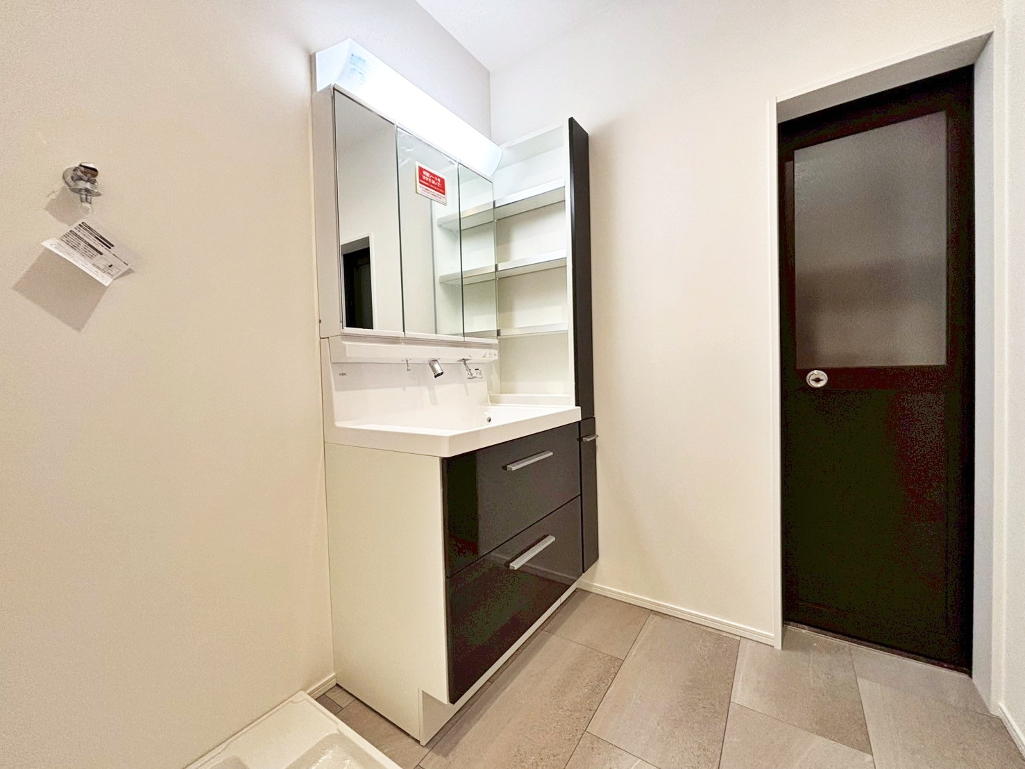 洗面スペースは、スタイリッシュながらも収納豊富な独立洗面台を採用。